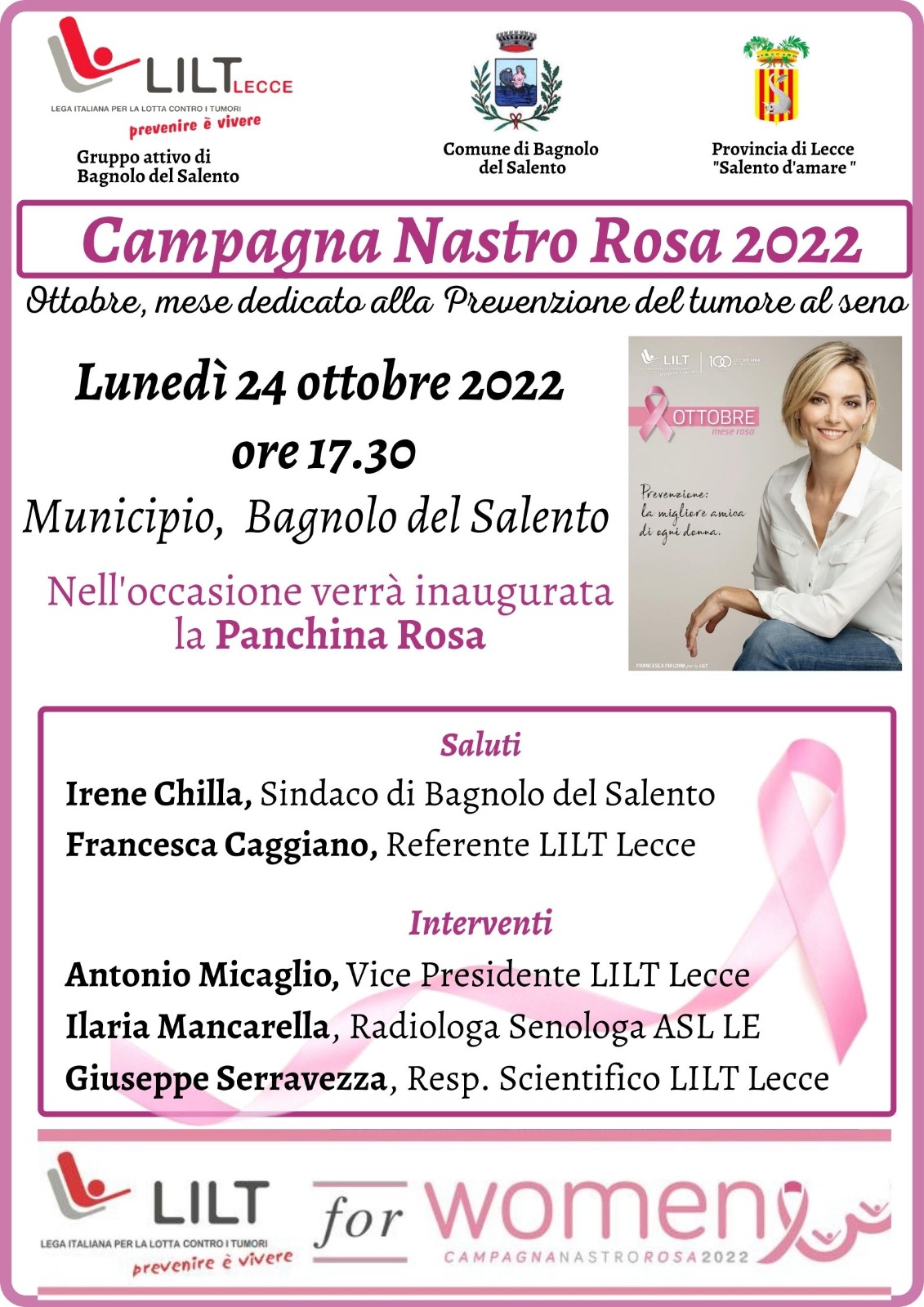 In collaborazione con la Lega Italiana per la lotta contro i tumori ed il patrocinio della provincia di Lecce Introdurrà l’iniziativa il Sindaco di Bagnolo del Salento, dott.ssa Irene Chilla, ed interverranno la dott.ssa Francesca Caggiano, Referente LILT Lecce, il dott. Antonio Micaglio, Vice Presidente LILT Lecce, la dott.ssa Ilaria Mancarella, Radiologa Senologa ASL Lecce, il dott. Giuseppe Serravezza, Responsabile Scientifico LILT Lecce.